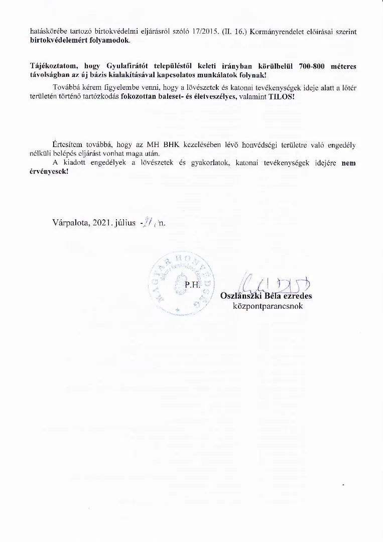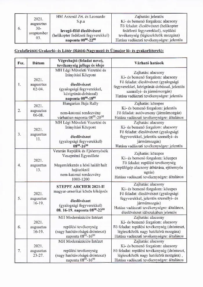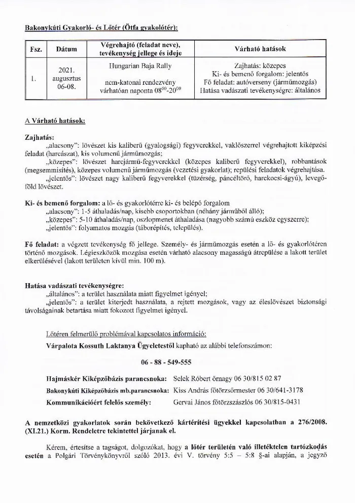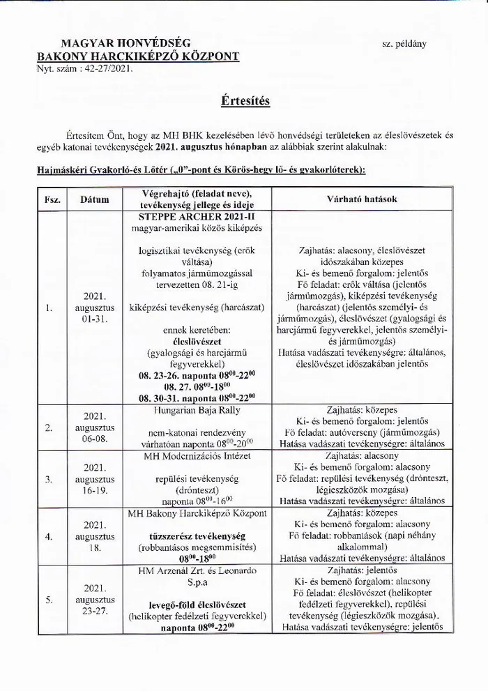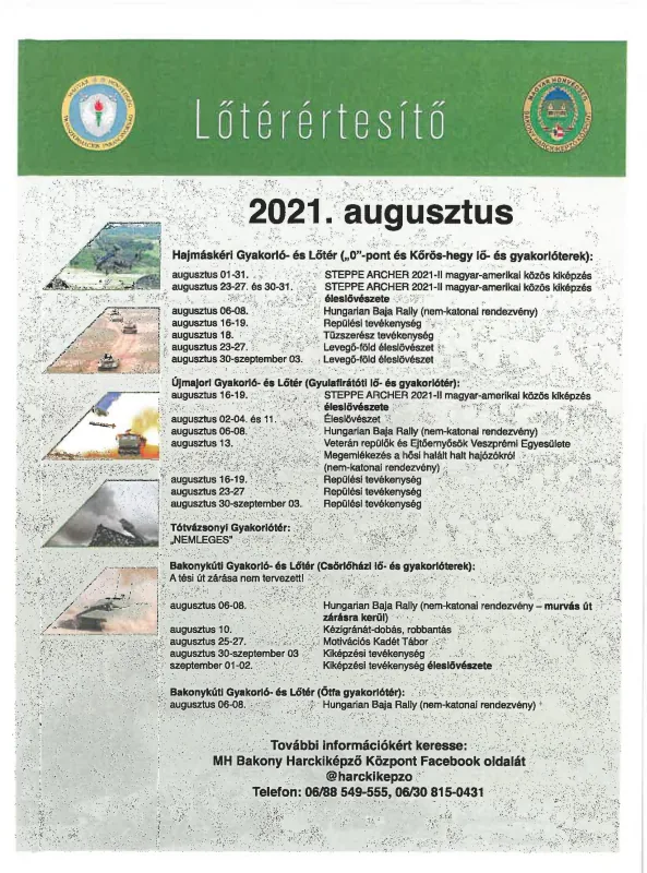 BAKONY HARCKIKÉPZŐ KÖZPONT honvédségi területein az éleslövészetek és egyéb katonai tevékenységek alakulása.