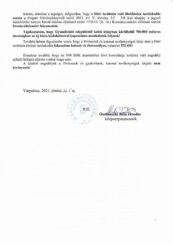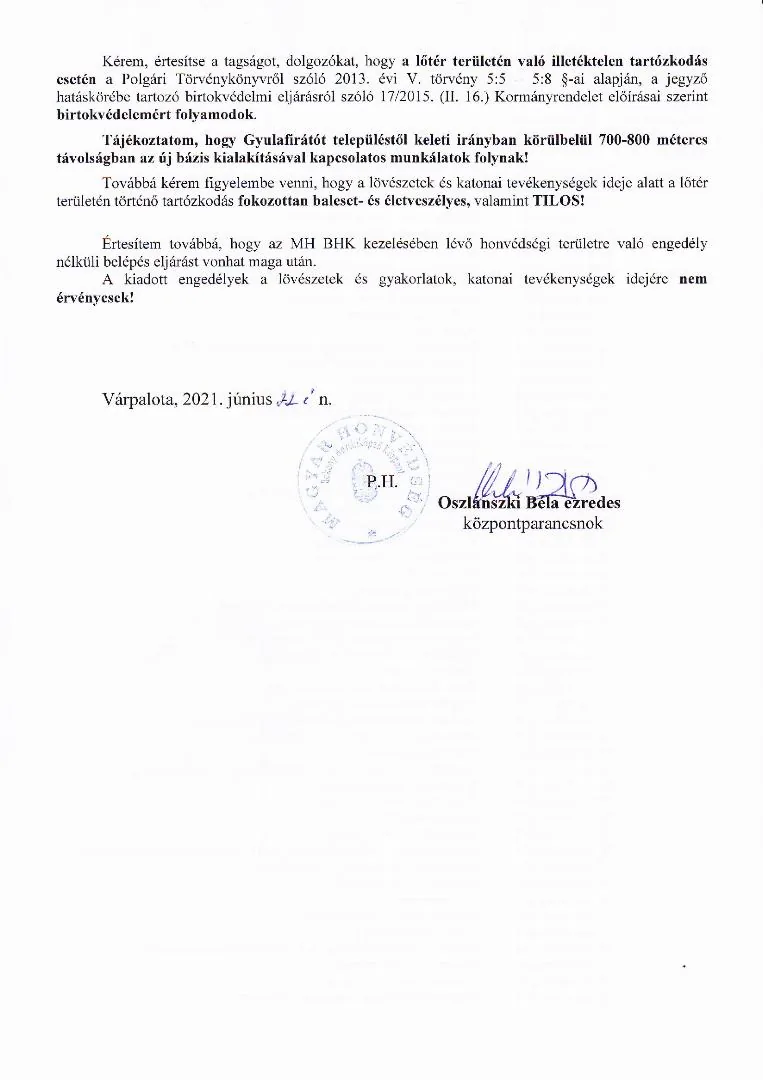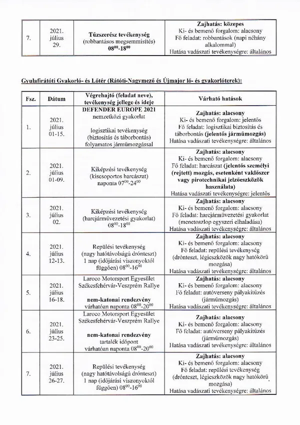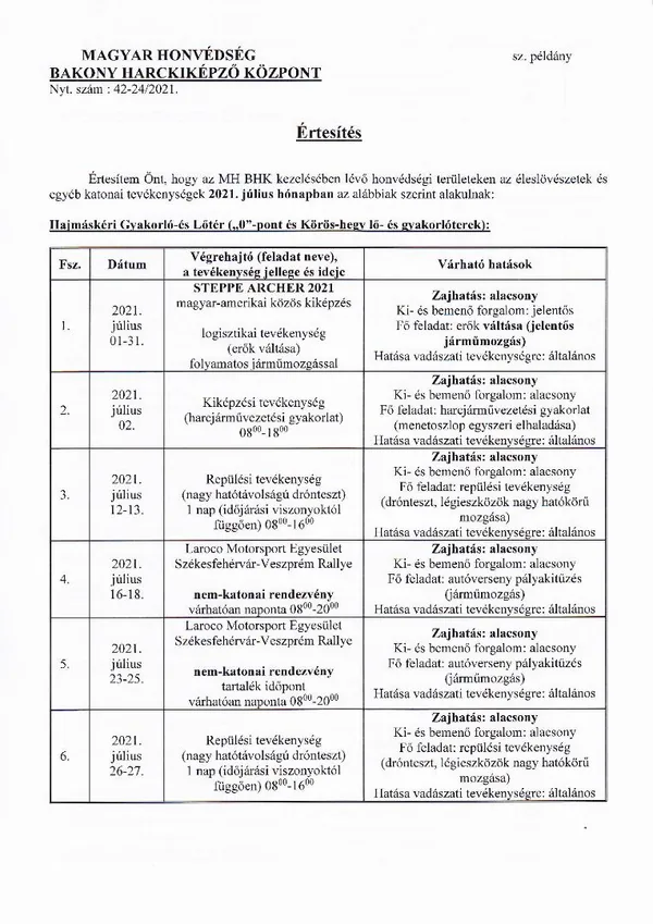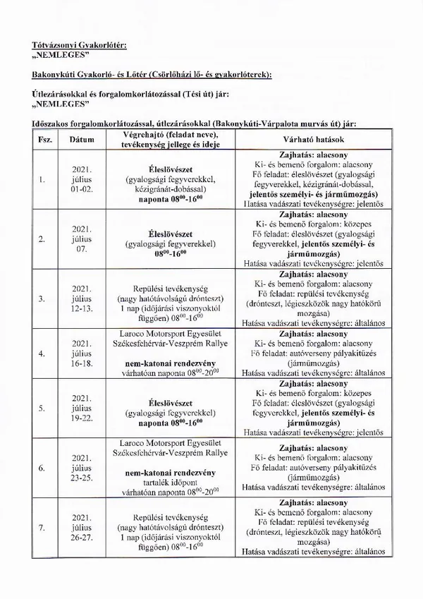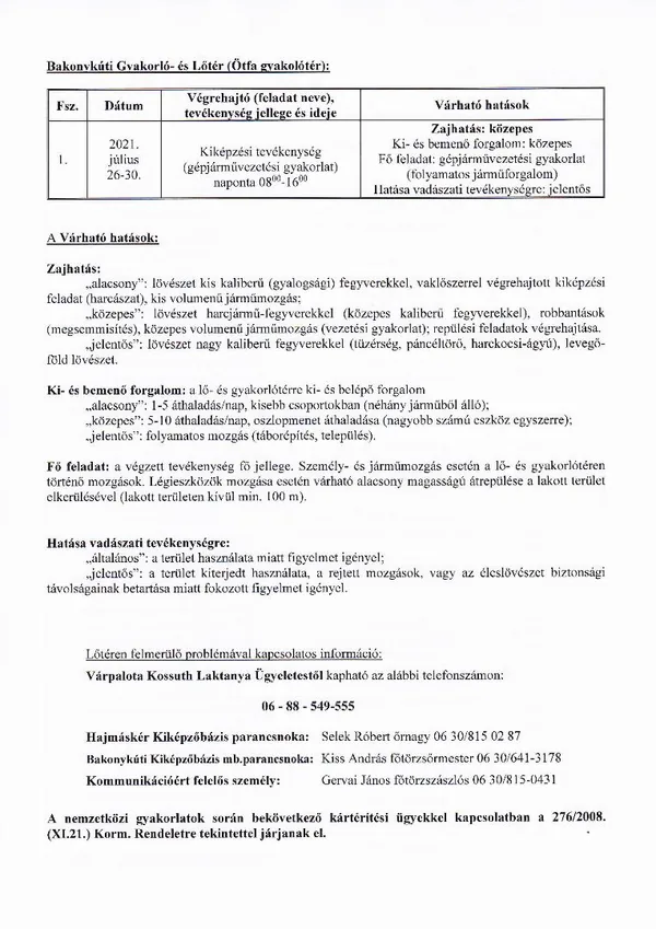 BAKONY HARCKIKÉPZŐ KÖZPONT honvédségi területein az éleslövészetek és egyéb katonai tevékenységek alakulása.