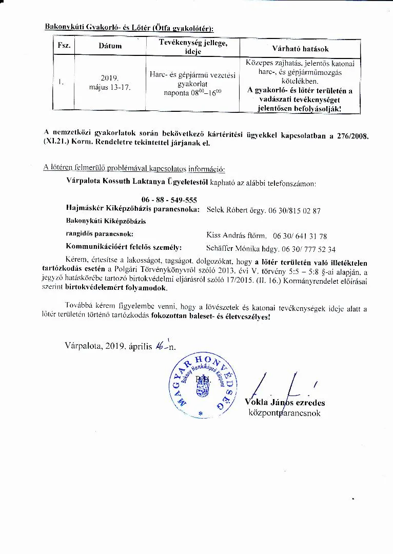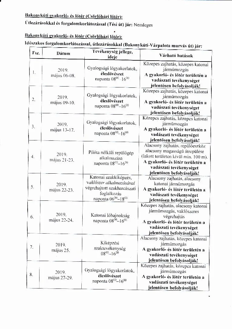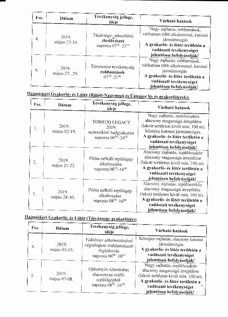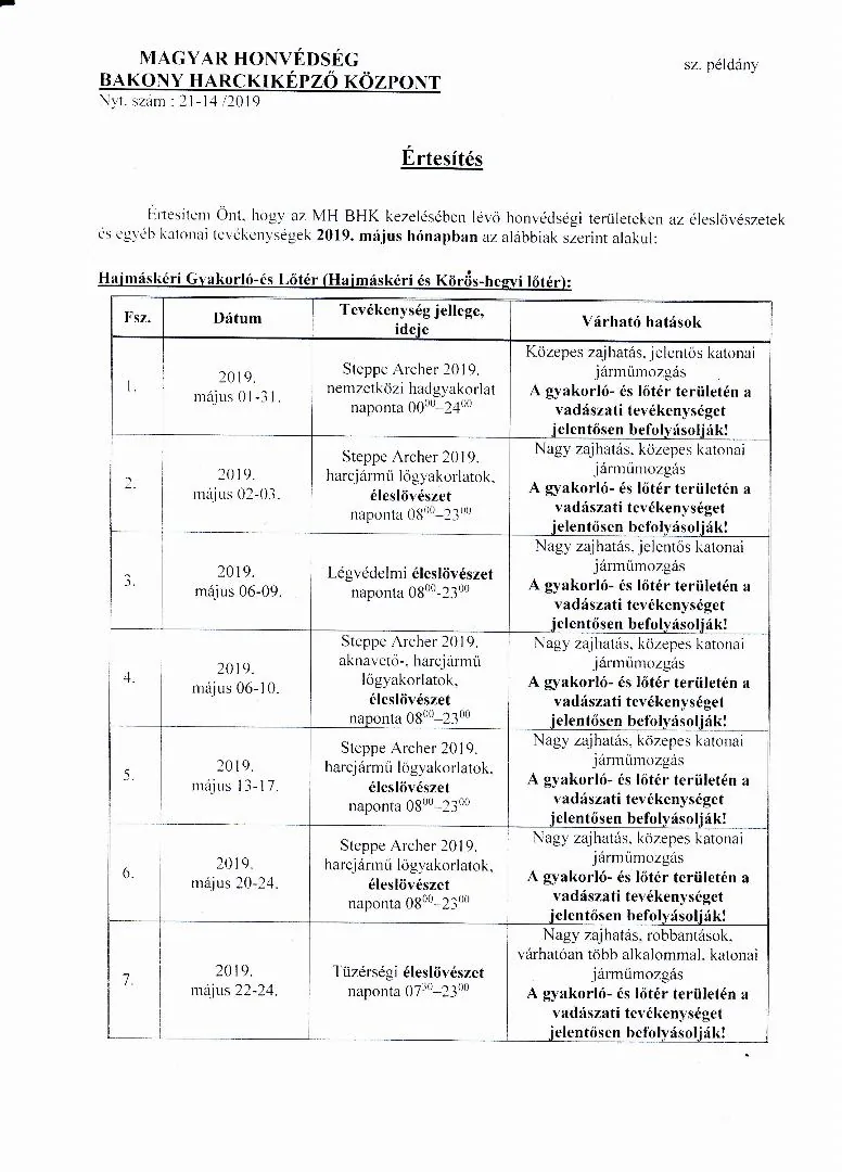 MH BHK 2019. május havi lőtérértesítő, Hajmáskér Kiképzőbázis tekintetében