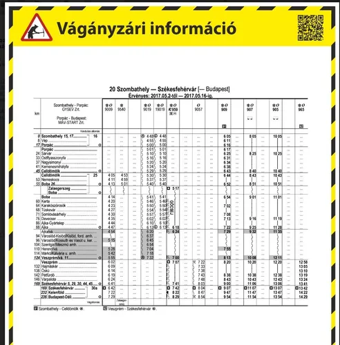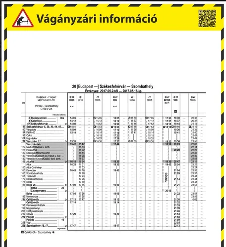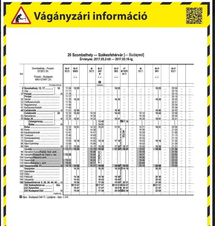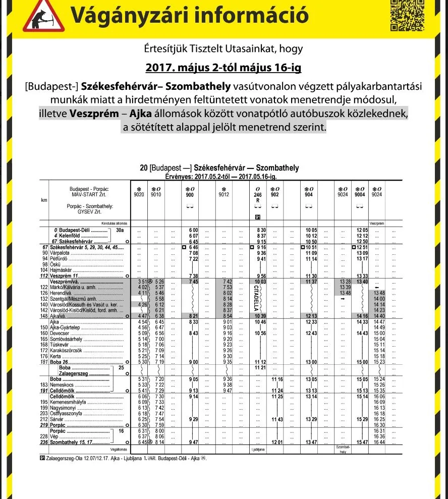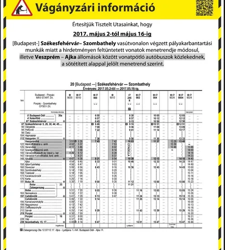 A MÁV-START Zrt tájékoztatása szerint 2017. május 2-tól május 16-ig [Budapest-] Székesfehérvár– Szombathely vasútvonalon végzett pályakarbantartási munkák miatt a hirdetményen feltüntetett vonatok menetrendje módosul,illetve Veszprém – Ajka állomások között vonatpótló autóbuszok közlekednek, a sötétített alappal jelölt menetrend szerint.