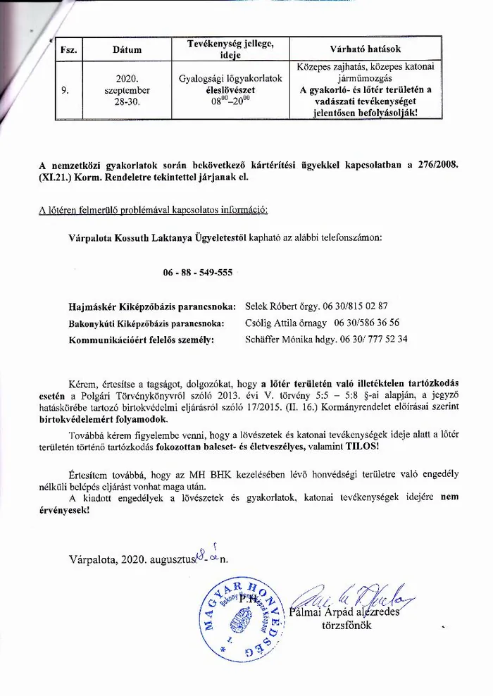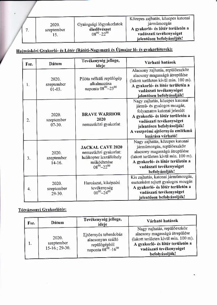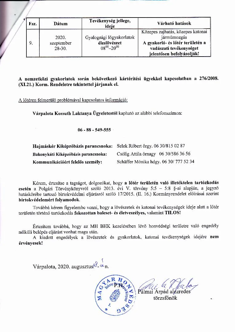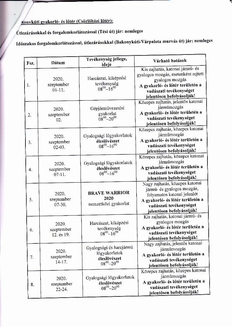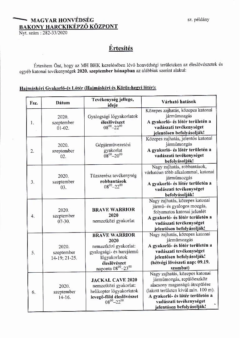 BAKONY HARCKIKÉPZŐ KÖZPONT honvédségi területein az éleslövészetek és egyéb katonai tevékenységek alakulása.
