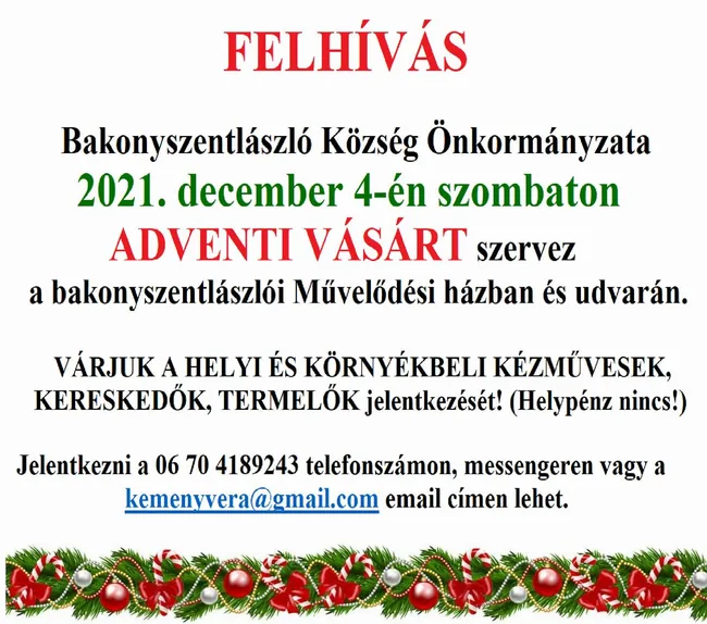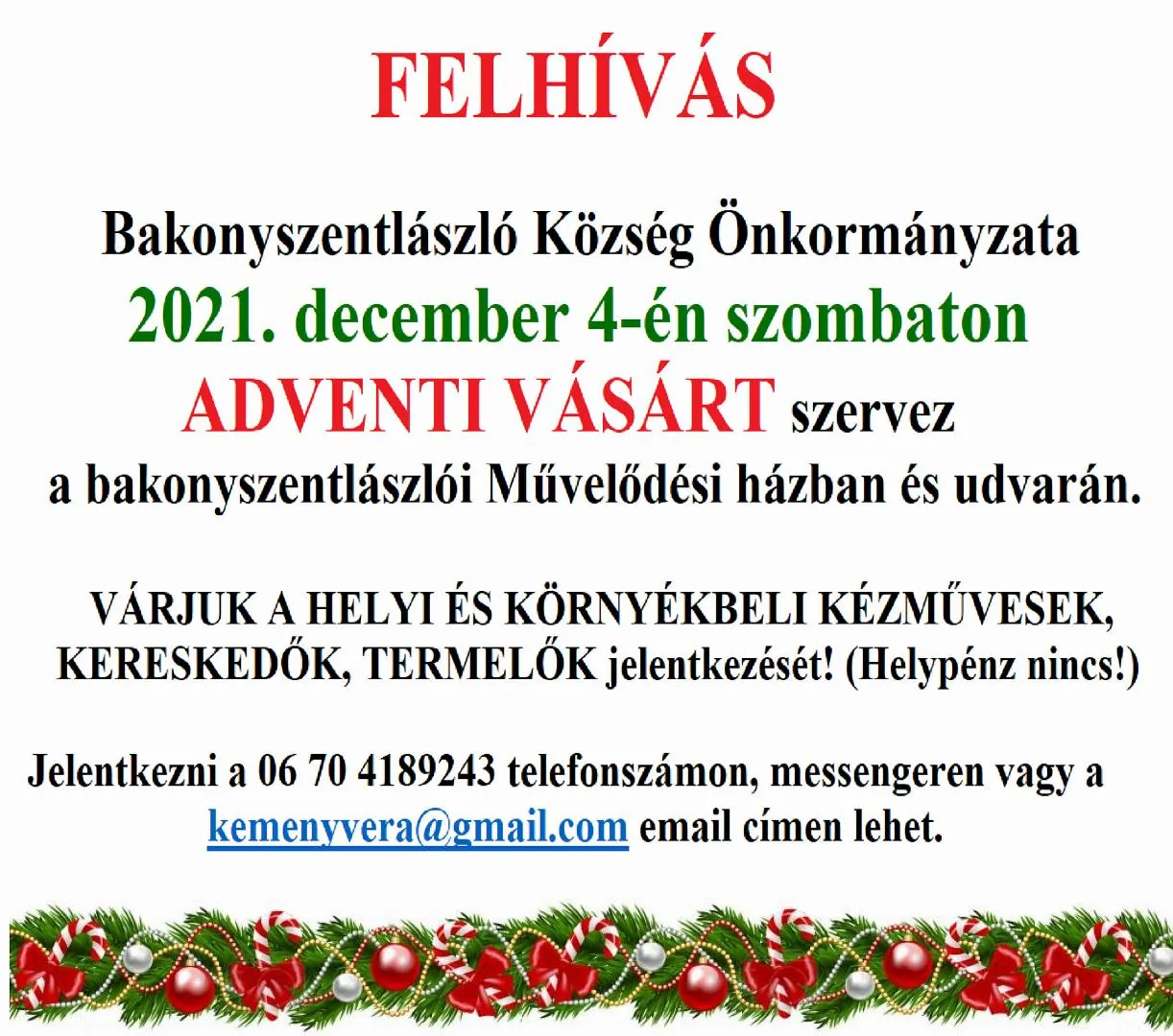 Várjuk a helyi és környékbeli kézművesek, kereskedők, termelők jelentkezését!(Helypénz nincs!)
