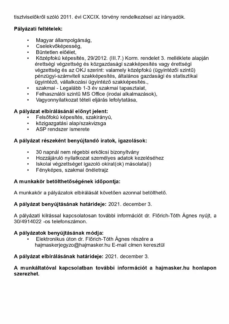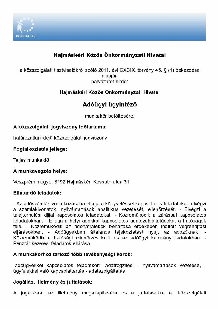 A munkavégzés helye: Veszprém megye, 8192 Hajmáskér, Kossuth utca 31