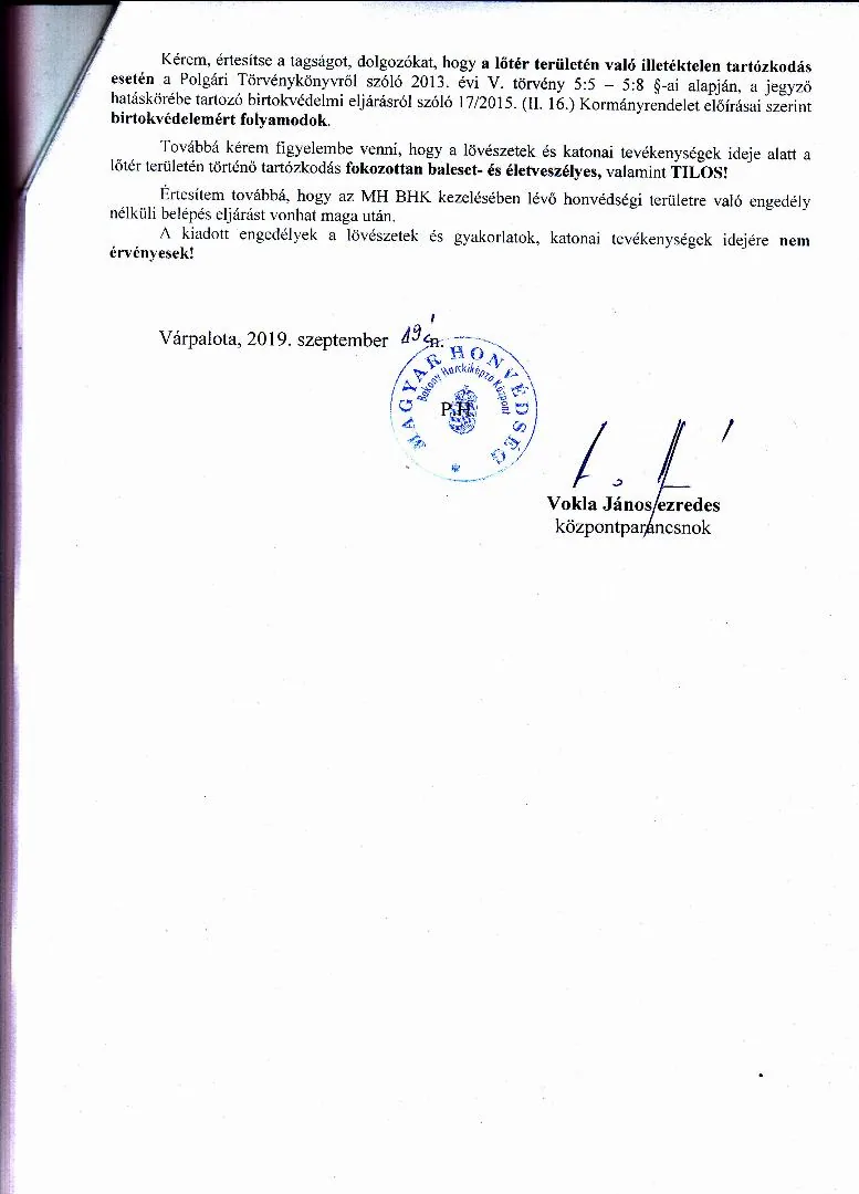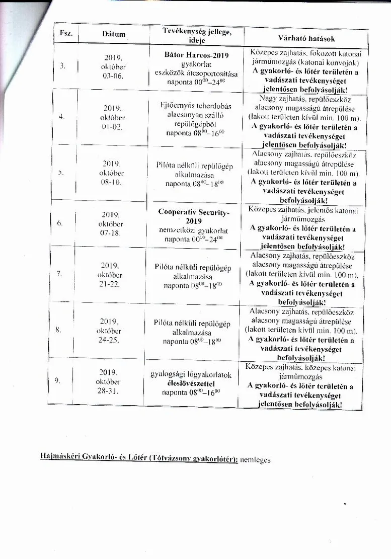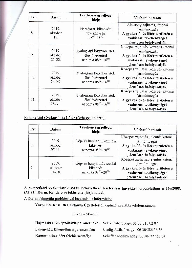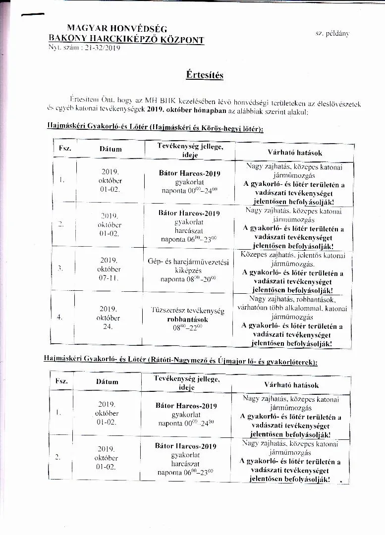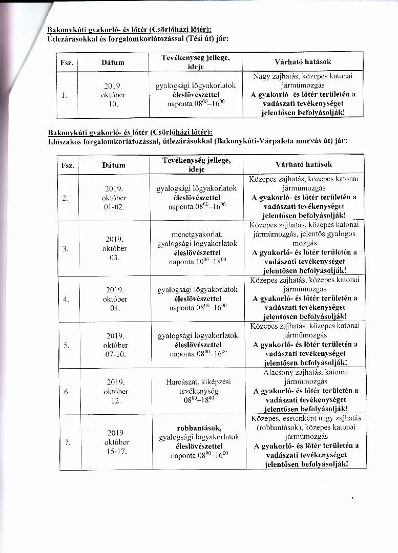BAKONY HARCKIKÉPZŐ KÖZPONT honvédségi területein az éleslövészetek és egyéb katonai tevékenységek alakulása.