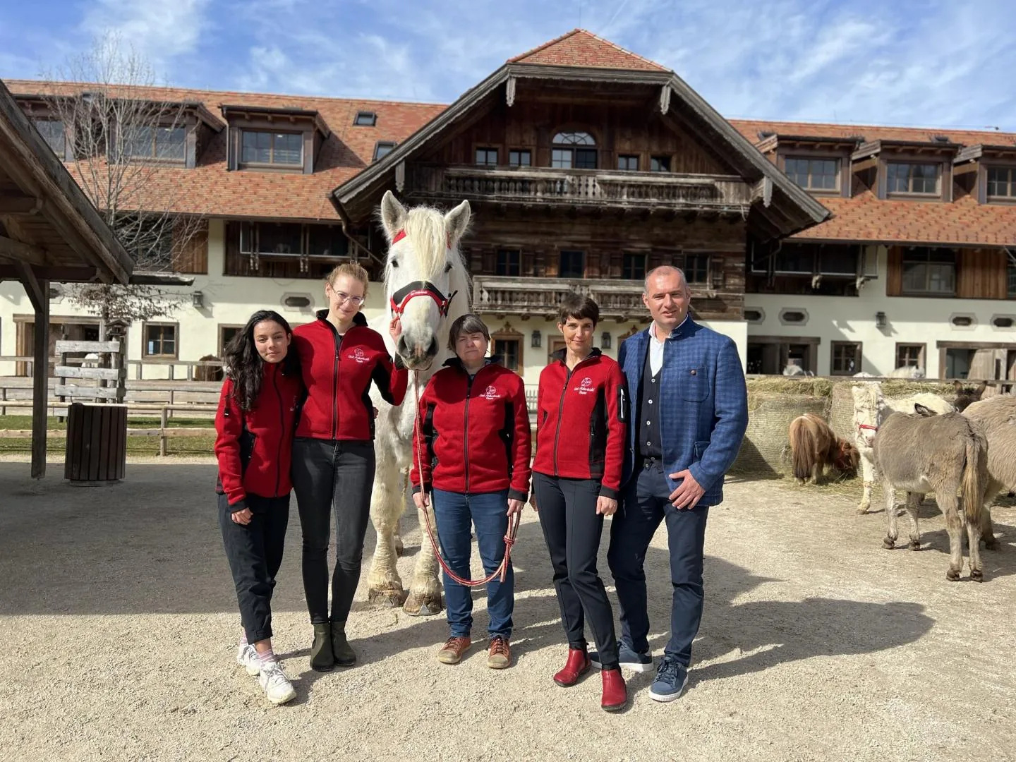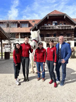 Kép 1+2: (jobbról balra) a Gut Aiderbichl Alapítvány kuratóriumi elnöke Dieter Ehrengruber, Prof. Dr. Florien Jenner, PD Dr. Auer Ulrike, Zsófia és Laura doktoranduszok, akik több mint három éve kutatják a lovak viselkedését.