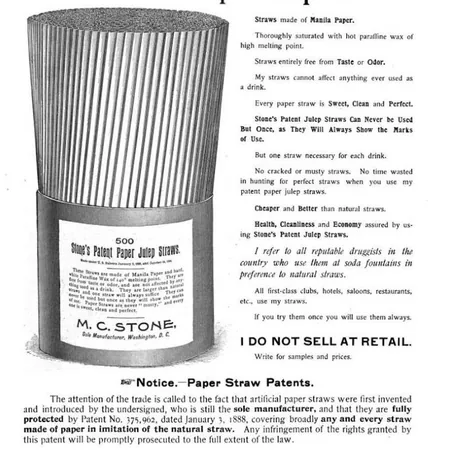 1888. január 3-án Marvin C. Stone megkapta az US375962 A számú szabadalmat a papír szívószálra. A találmány elismeréseként minden év január 3-án az emberek országszerte megünneplik a Szalma Szalma Nemzeti Napját. Később Stone tovább finomította találmányán egy olyan gép megépítésével, amely a papír külsejét viasszal vonja be, hogy összetartsa, így a ragasztó nem oldódik fel a Bourbonban, amelyet szeretett inni.