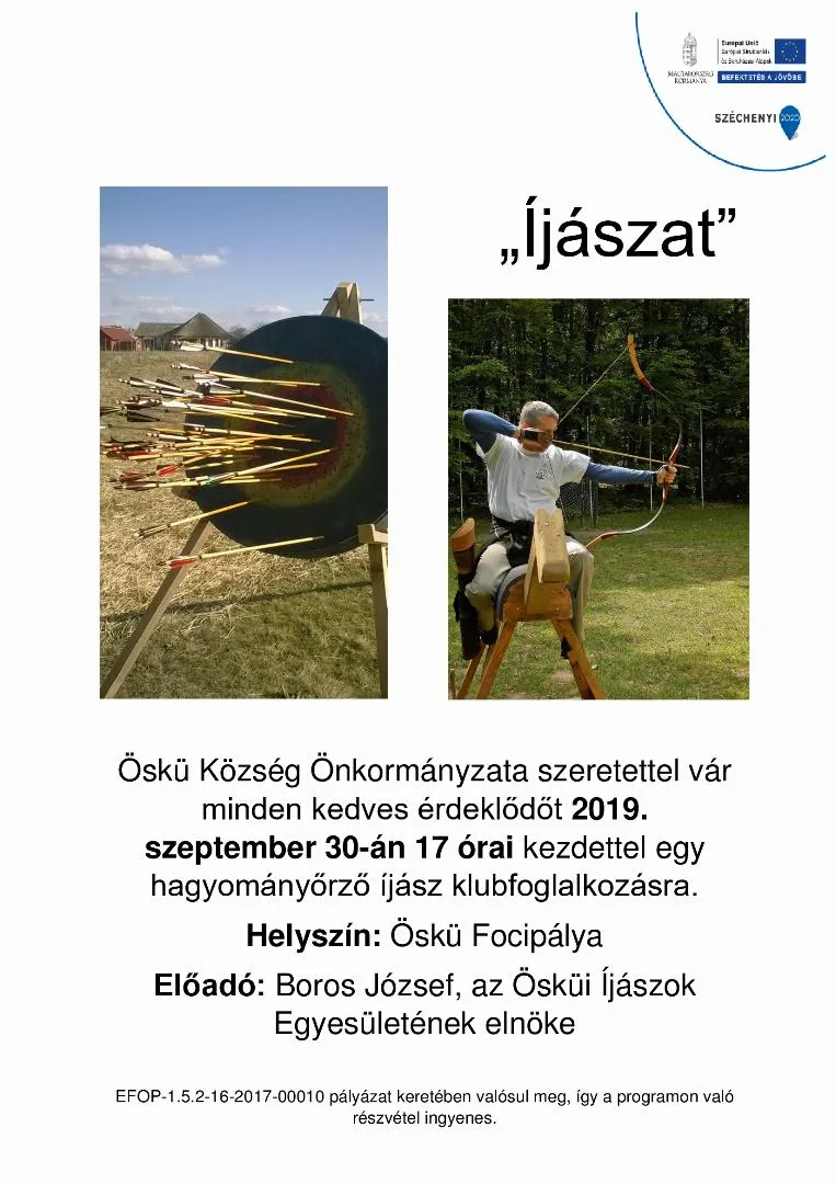 Öskü Község Önkormányzata szeretettel vár minden kedves érdeklődőt 2019. szeptember 30-án 17 órai kezdettel egy hagyományőrző íjász klubfoglalkozásra.
