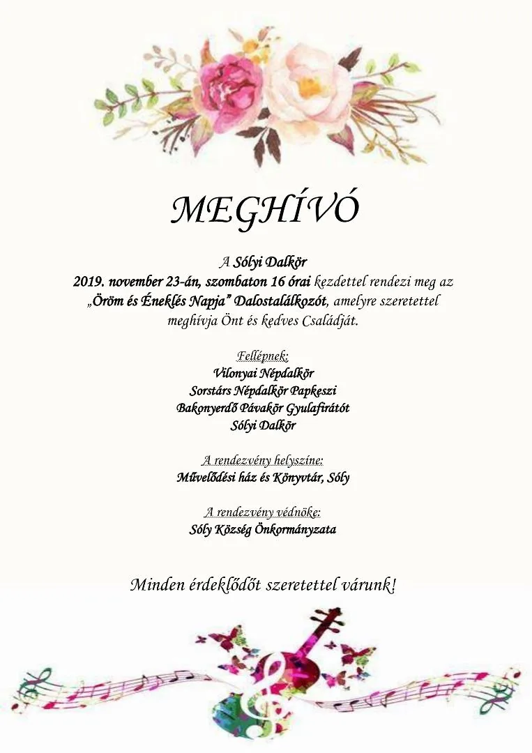 2019. november 23-án, szombaton 16 órai kezdettel rendezi meg az „Öröm és Éneklés Napja” Dalostalálkozót, amelyre szeretettel meghívja Önt és kedves Családját.