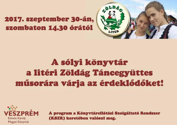 A sólyi könyvtár a litéri Zöldág Táncegyüttes műsorára várja az érdeklődőket! A program a Könyvtárellátási Szolgáltató Rendszer keretében valósul meg.