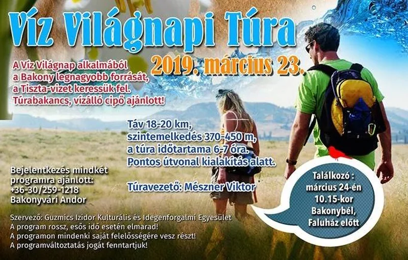 Szervezett túra túravezetővel. Indulás 10.15-kor a Faluház elől (Pápai utca 7.) 5-6 óra időtartam, sok vizes átkeléssel, így fontos a vízálló lábbeli. Közepesen nehéz túrának számít. Úticél: Mátyás pince Előzetes bejelentkezés kötelező: 30/259-1218 Plakát: