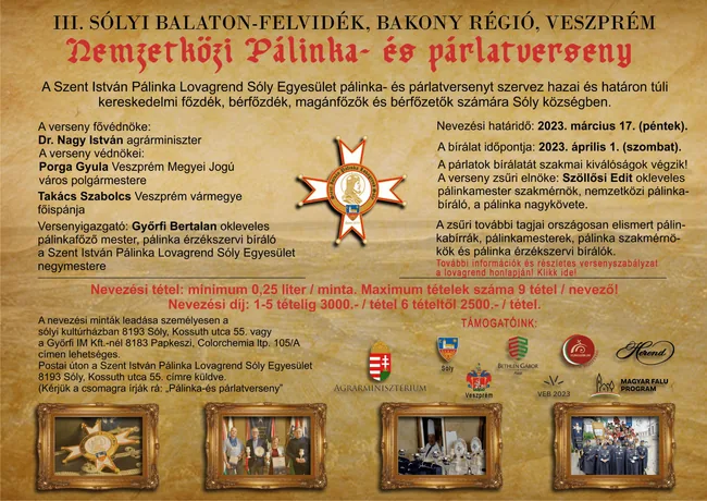 III. Sólyi, Balaton-felvidék, Bakony régió, Veszprém, Nemzetközi pálinka- és párlatverseny