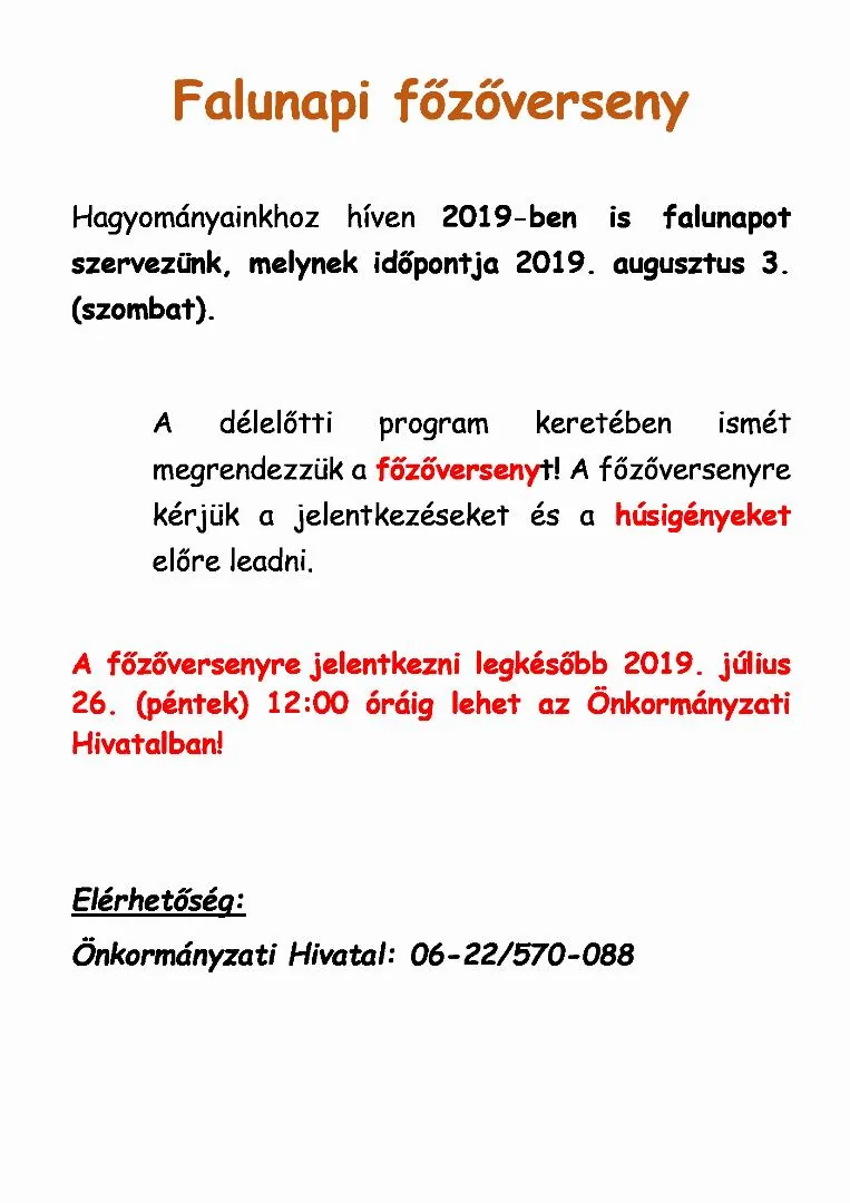 Idén is várjuk ebédre azokat a lakosokat, akik nem vesznek részt a főzőversenyen! Ebéd után lángos kapható! - 13:30 Élő csocsó bajnokság / Nevezni 13:00 - tól a helyszínen lehet, 5 fős csapatokkal.