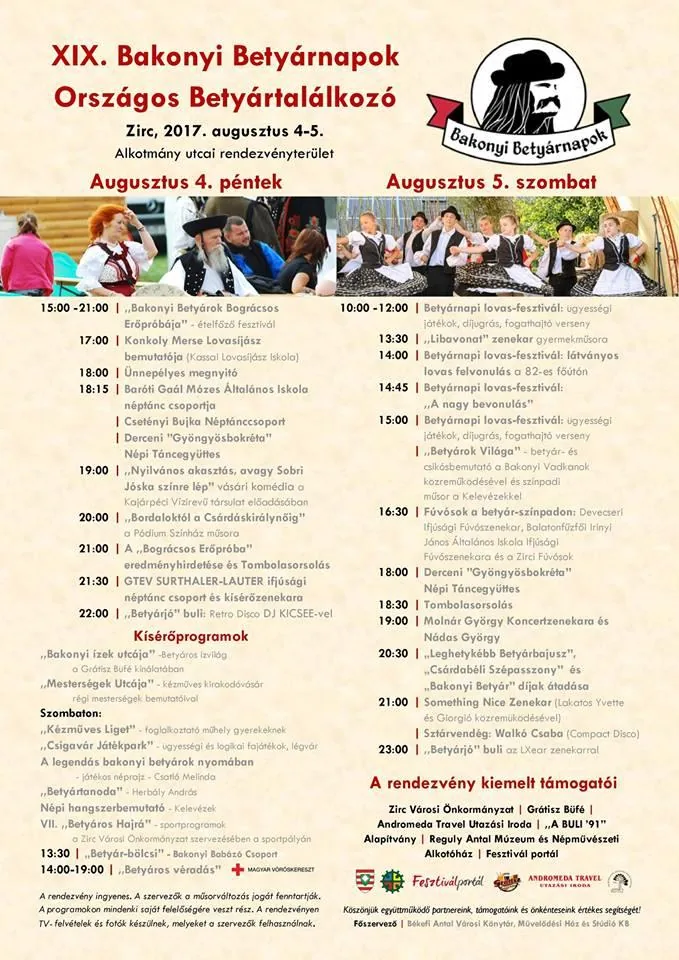 A rendezvény idén is a „Bakonyi Betyárok Bográcsos Erőpróbájával” veszi kezdetét, hiszen egy igazi betyár és csárdabéli szépasszony üres bendővel nem indul neki az előtte álló hosszú, eseménydúsnak ígérkező betyárkodásnak. „Betyárjó” színpadi produkciók várják a közönséget: a néptánccsoportok dobogó csizmáinak ritmusa és suhogó szoknyái, a népzene, a könnyűzene, a szórakoztató műfaj népszerű zenekarai, előadói, tehetséges fiatalok lendületes produkciói és „Sztárok a betyárok között” képviseltetik magukat a színpadon. Kicsi és nagy egyaránt aktívan kiveheti részét a betyárkodásból: a gyermekeket „Betyártanoda”, zenés-játékos műsorok, játszóház, kézműves liget, népi játékpark várja. Hagyományőrző betyárcsoportok a betyárvilág korhű felidézésével és bemutatókkal hangolnak az esti mulatságokra. A szombati program egyik leglátványosabb eleme a várost átszelő 82-es főúton áthaladó, ostorcsattogtatással és muzsikaszóval kísért lovas, fogatos, betyáros felvonulás. A Betyárnapi lovas-fesztiválon kezdő és haladó lovasok ügyességi versenyei és a fogathajtók versenyei várják a közönséget. Közben „Betyáros Hajrá!” mottóval sportversenyek is színesítik a programkínálatot: Bakonyi Betyárkupa kispályás labdarúgó torna, nyílt lövészverseny, Öregfiúk labdarúgó mérkőzés és „Batyuval szemben a kapuval” tizenegyesrúgó-verseny. Minden évben avatunk újabb Bakonyi betyárokat és csárdabéli szépasszonyokat, díjazzuk a Leghetykébb betyárbajusz gazdáját, és mindkét este „Betyárjó buli” zárja a rendezvényt. 2017-ben is tartalmas percekkel töltjük meg a képzeletbeli betyárbatyut, kicsik és nagyok betyáros jókedvéről gondoskodunk, mert remek hangulatú, közös vigasságokból idén sem lesz hiány!