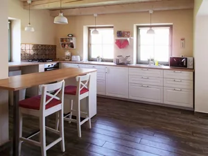 Az épületben található három szoba, külön fürdőszobákkal, nappali, teljesen felszerelt konyha (mikró, kávéfőző, kenyérpirító, tűzhely, kombinált hűtő, mosógép), étkező, infraszauna, hozzá tartozó pihenőhellyel.